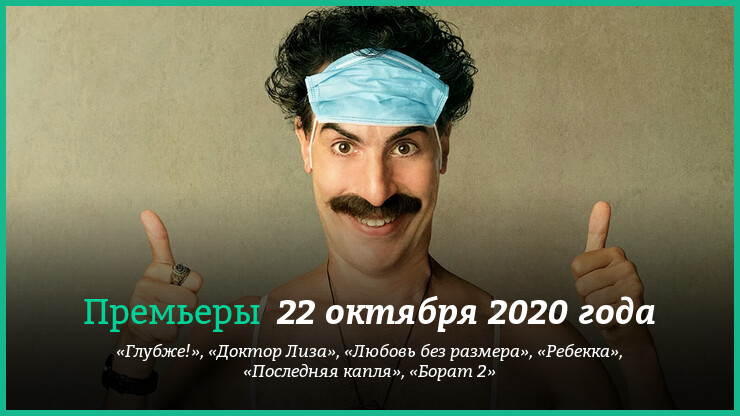 Страшно сказать, но в списке крупных премьер сразу три отечественные картины. На киношном безрыбье в список фильмов недели проникли провокационная комедия «Глубже!», драма «Доктор Лиза» и ещё одна комедия — «Любовь без размера». Из зарубежных релизов — выходящая на цифровых платформах «Ребекка» с Арми Хаммером и Лили Джеймс, драмеди «Последняя капля» Софии Копполы и комедия Саши Барона Коэна «Борат 2».