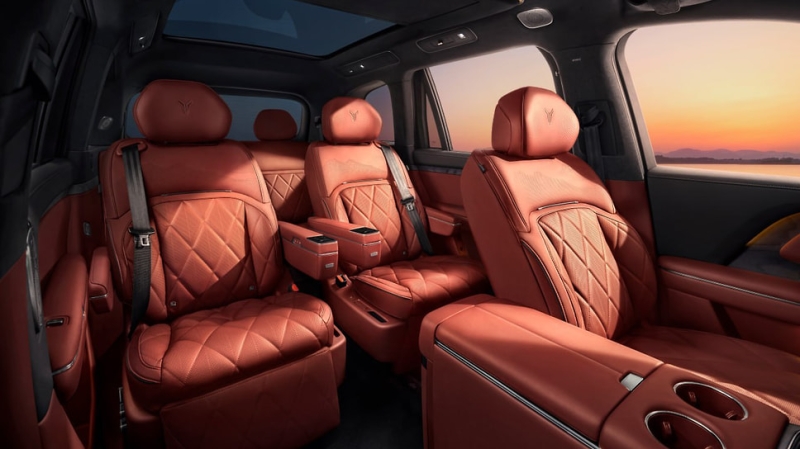 На передней панели находится «плавающий» сенсорный экран и цифровая панель приборов, центральная консоль имеет две площадки для беспроводной зарядки и отсек для хранения вещей. Предусмотрены проекционный дисплей с дополненной реальностью, встроенный холодильник, складные столики, двухсекционная панорамная крыша и потолочный экран для задних пассажиров. В перечне других опций — боковые подножки с электроприводом и подсветкой, а также электроприводы и доводчики дверей.